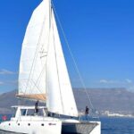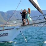 A panoramic vista of iconic Table Mountain and the sparkling waters of the Atlantic Ocean greet passengers as the luxury catamaran glides along the coastline.