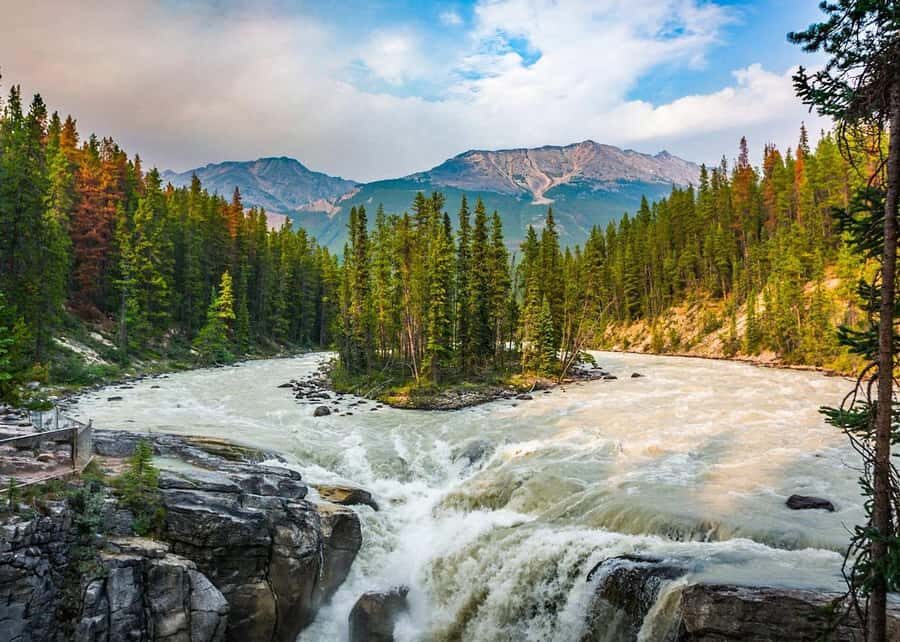 Following the glacier, the tour stops at Sunwapta Falls, a thundering cascade that embodies the raw power of nature. The 40-minute stop allows ample time to photograph and hear the roar of the water. Later, a visit to Tangle Creek Falls adds another tiered waterfall for the waterfall enthusiast.