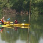 Paddling gently, they’re immersed in a world teeming with life – schools of fish dart beneath the surface, herons and kingfishers perch on the gnarled branches, and the occasional crocodile may surface nearby.