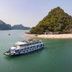 The cruise boat docks at the picturesque Ti Top Island, offering a chance to relax on the beach or hike up to the island’s summit for panoramic views of the stunning Ha Long Bay.