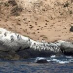 The shimmering Pacific Ocean provides a serene backdrop, with its gentle waves lapping at the shore. Towering cliffs and lush greenery frame the scene, creating a truly picturesque setting.