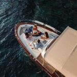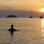 Travelers can enjoy the fresh sea breeze, sip alcoholic beverages, and relax on inflatable platforms as they take in the stunning sunset views over the Gulf of Poets.