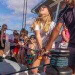 There are no age restrictions for this catamaran trip. Children of all ages are welcome to join, though parents should ensure their kids can safely participate in the water activities.