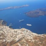 Next, you’ll glide over Fira, the island’s bustling capital. Its whitewashed buildings, blue-domed churches, and cliffside streets make for iconic sights. From above, you’ll appreciate the way the town hugs the caldera’s edge, offering mesmerizing vistas of the deep blue sea below.