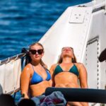 The cruise features swimming stops, snorkeling equipment, stand-up paddle, and inflatables, along with opportunities for relaxation and sunbathing on the deck.